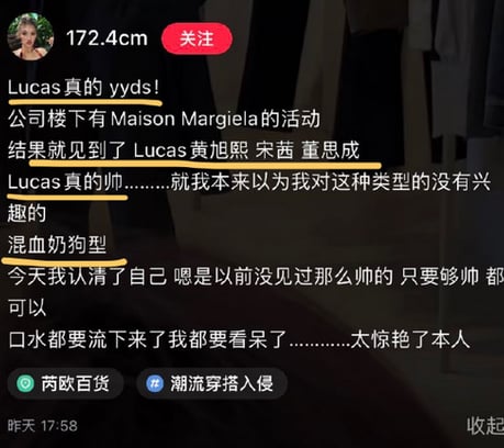 172.4cm: Lucas really yyds! (means really awesome) Today at the event I saw Lucas Huang Xuxi, Song Qian and Dong Sicheng. And Lucas is so handsome. I thought I was not interested in this slightly mixed looking puppy kind of visual....Today I recognize myself, um, I just haven’t seen this type of beauty before. So handsome, as long as he is handsome enough, the water will flow down (means drooling). I have to watch him. Too amazing.